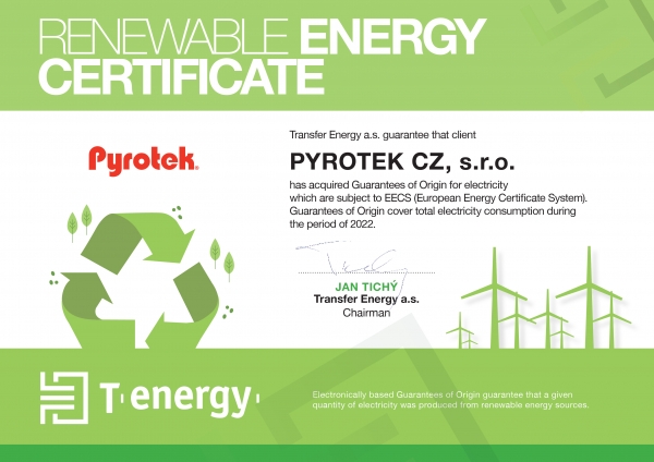 Pyrotek Blansko is now officially "green," recently receiving a "Renewable Energy Certificate" from an important European Union institution.