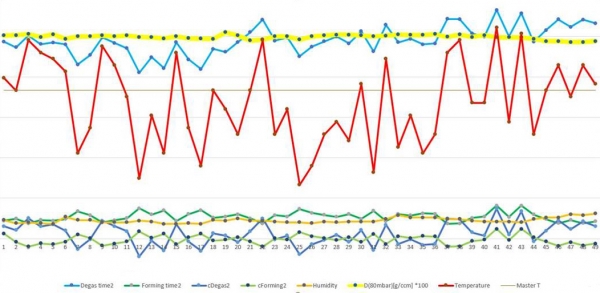 In a test at a premier wheel caster in Western Europe, the degassing unit maintained a consistent metal density during the degassing cycle. The graph below depicts different process variables monitored during the degassing cycle. The metal density (yellow line) remained consistent even while the temperature (red line) varied considerably throughout the cycles.