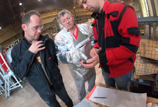 Pyrotek's Michael Machado and Tomáš Mazálek working with a furnace operator at PUNCH Powerglide foundry in Strasbourg, France.