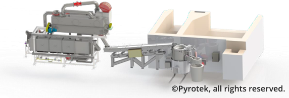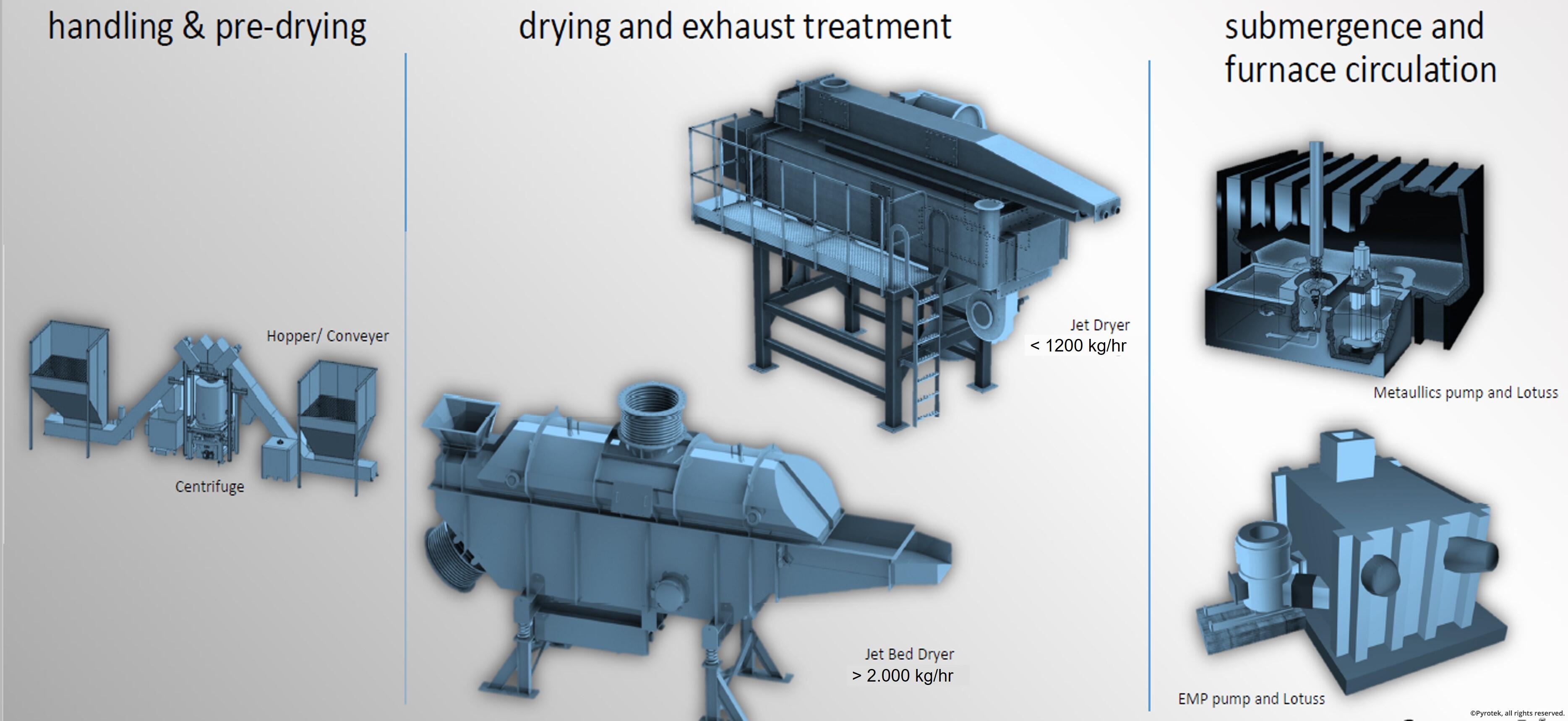 A compact, stand-alone pre-wired chip dryer with integrated thermal oxidiser is engineered to allow customers to position the unit so it feeds directly into a Pyrotek LOTUSS system (optional) for optimal energy and melt recovery targeted for in-house chips processing.